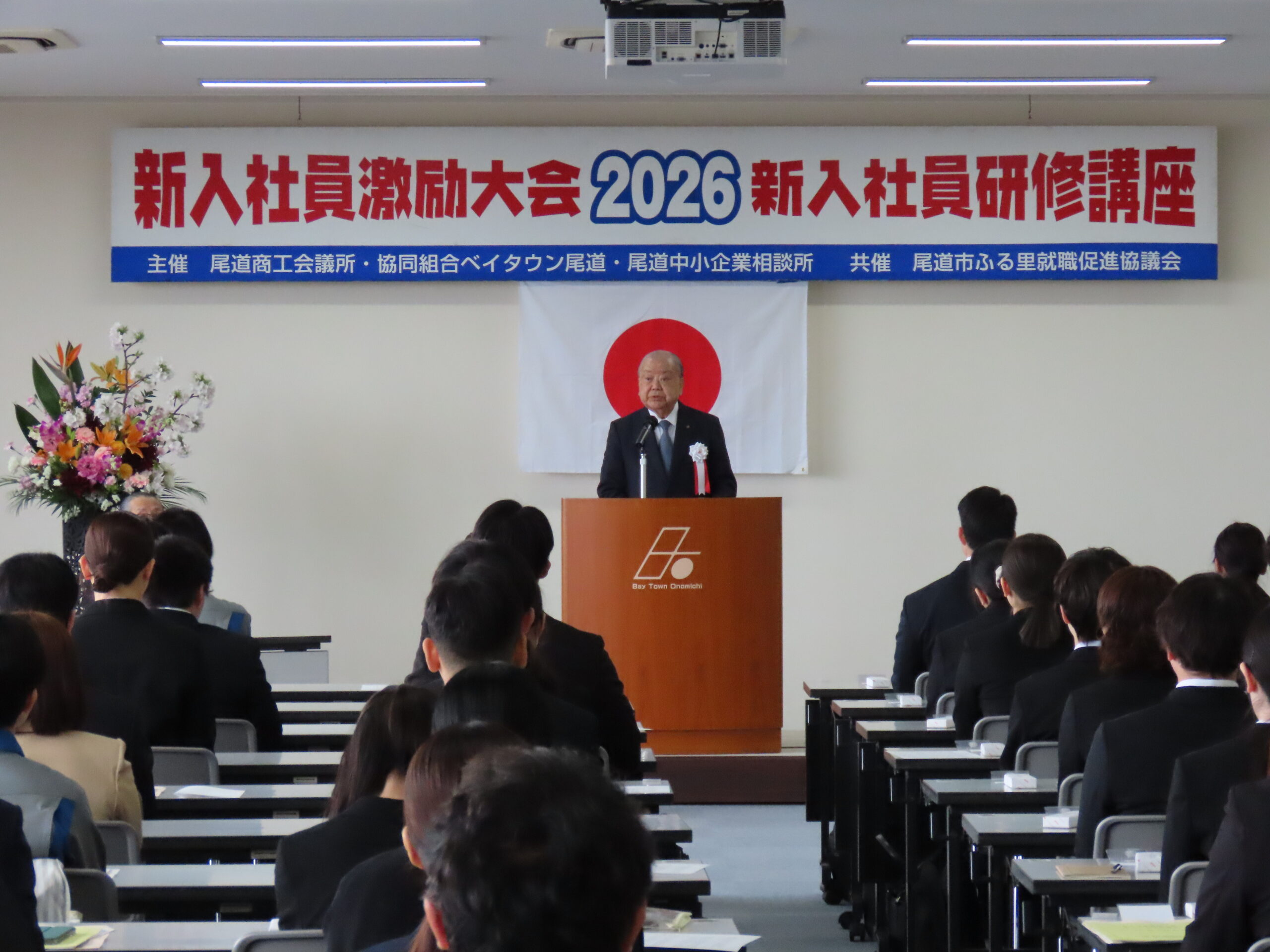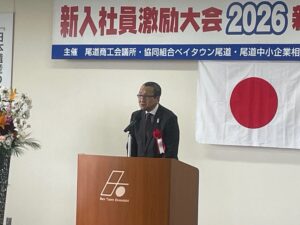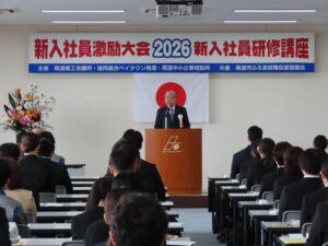 令和8年4月7日(火)組合会館にて澤田尾道副市長、大本尾道市議会副議長、友岡尾道公共職業安定所所長、荒井尾道市立大学学長をお招きし、尾道商工会議所と共催で平和8年度新入社員激励大会を開催しました。 組合員及び尾道市内の事業所に就職された新入社員87名が参加しました。 福井理事長と澤田尾道副市長より新入社員の方々に対しはなむけの言葉を送り励ましました。